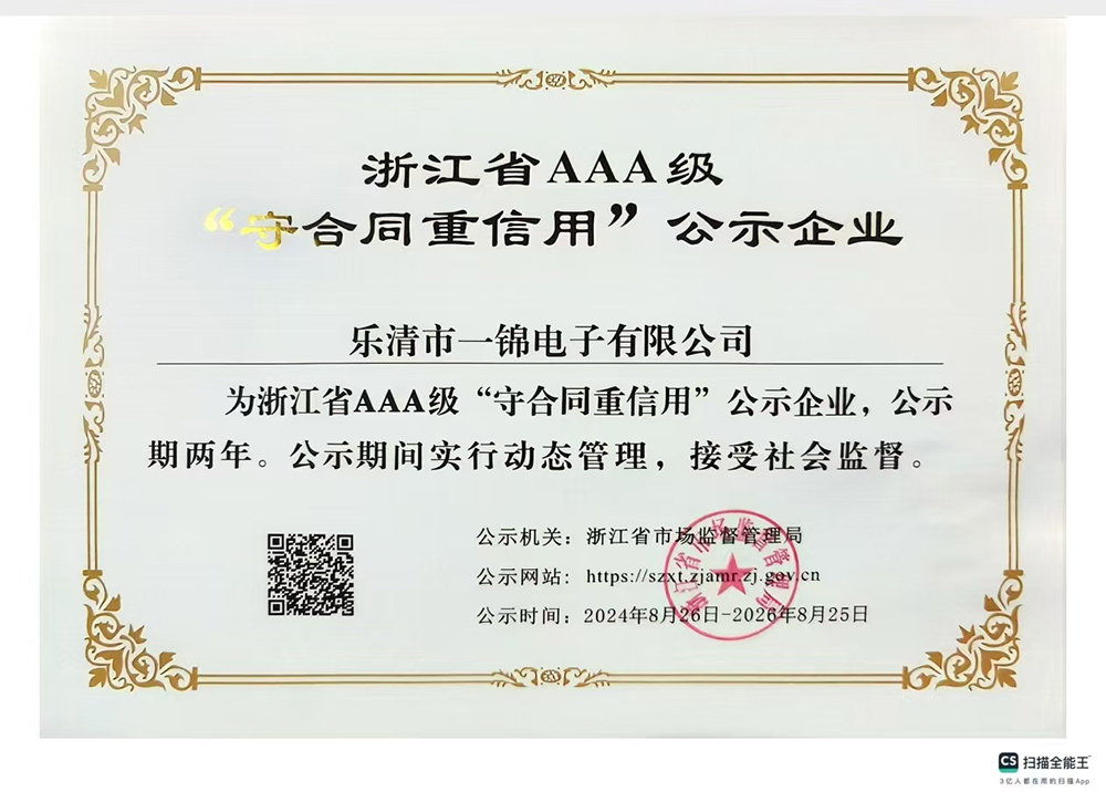 公司通過自主研制、合作研制等多種方式,建立了檢測試驗室,目前交變老化、耐熱、特性檢測等處于業內領先水平,并組成了一支專業、規范的質量檢驗、控制隊伍,產品質量控制已同國際接軌。公司已通過“浙江省科技型企業”、“國家高新技術企業”、“浙江省成長型企業”“溫州市研發中心”的認定,并通過:GB/TI9001-2016/ISO9001:2015質量管理、GB/T24001-2016/ISO14001:2015環境管理、GB/T29490-2013知識產權管理等體系認證。
