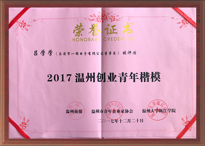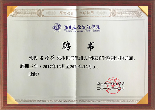 1、2017 年,呂學學被評為“溫州創業青年楷模”,被溫州大學甌江學院聘為為期三年的“創業指導老師”;